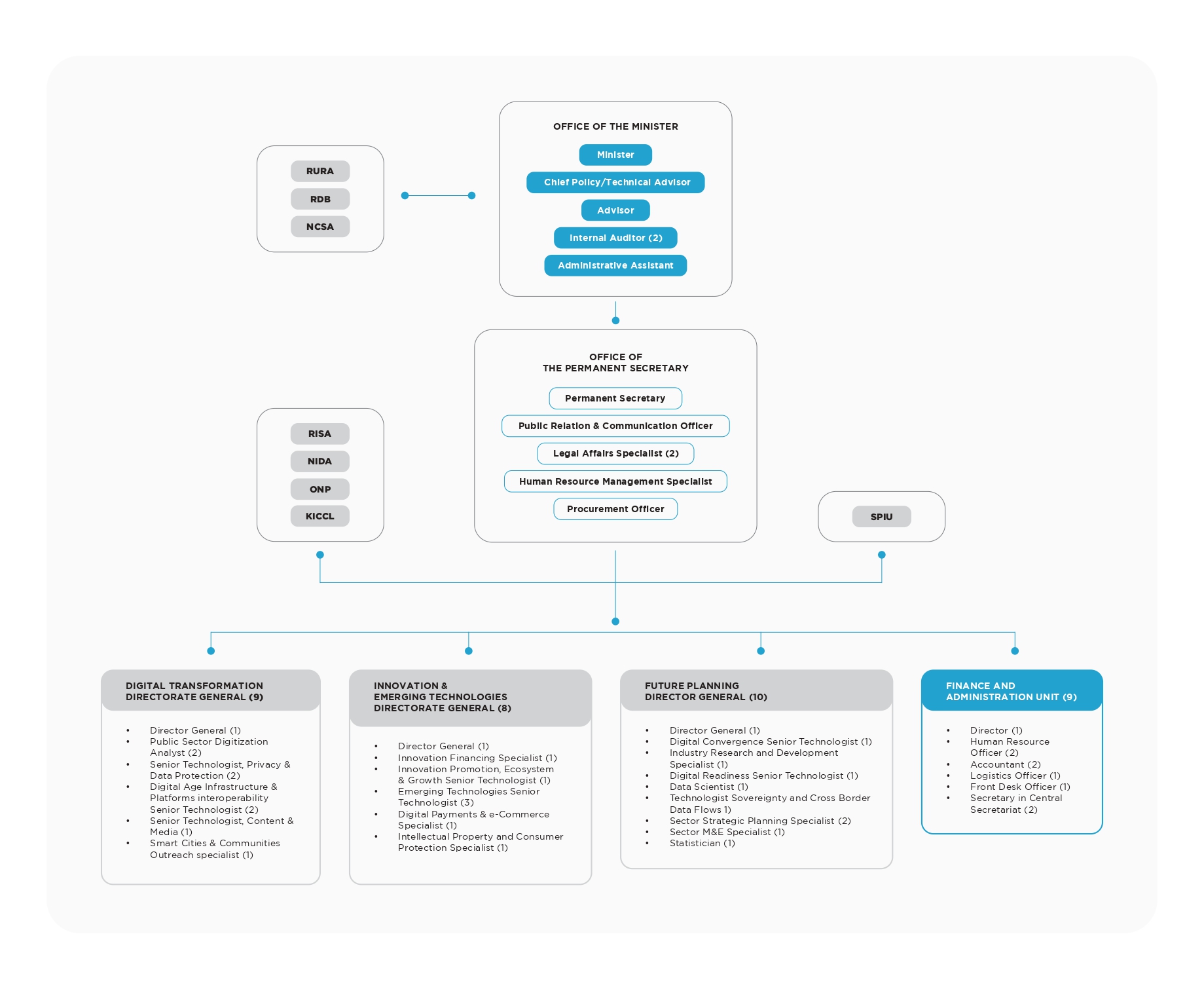 MINICT ishyira mu bikorwa inshingano zayo binyuze mu nzego eshatu z’Ubuyobozi Bukuru – Kuzana Impinduka no Guhanga Udushya, Igenamigambi ry’Ahazaza n’Ikoranabuhanga Rigenda Rivuka – hibandwa ku gushyiraho za politiki, kongera ubumenyi-ngiro, no gukoresha ikoranabuhanga rigezweho nk’uburyo bwo kwishyurana abantu badahererekanya amafanga mu ntoki. Minisiteri ikorana n’ibigo biyishamikiyeho mu gushyira mu bikorwa politiki z’igihugu mu by’ikoranabuhanga (ICT) zigamije kwihutisha impinduka mu ikoranabuhanga no kwirinda ko hagira uhezwa muri gahunda z’ikoranabuhanga.